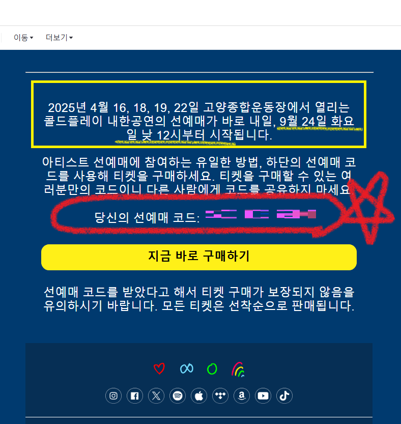 ✅ 아티스트 선예매를 할 수 있는 코드는 전날 이메일으로 받을 수 있다.