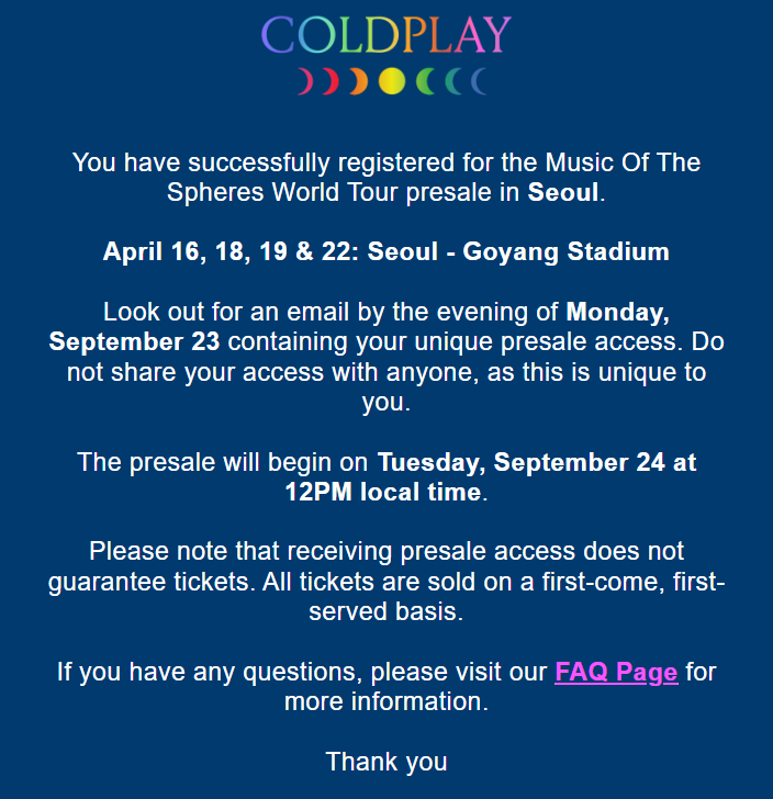 Coldplay 내한공연 일반 예매는 9월 27일 금요일 오후 12시에 시작된다.
