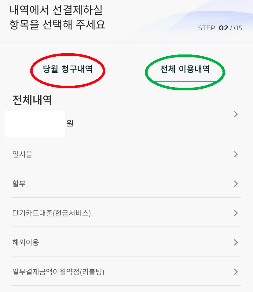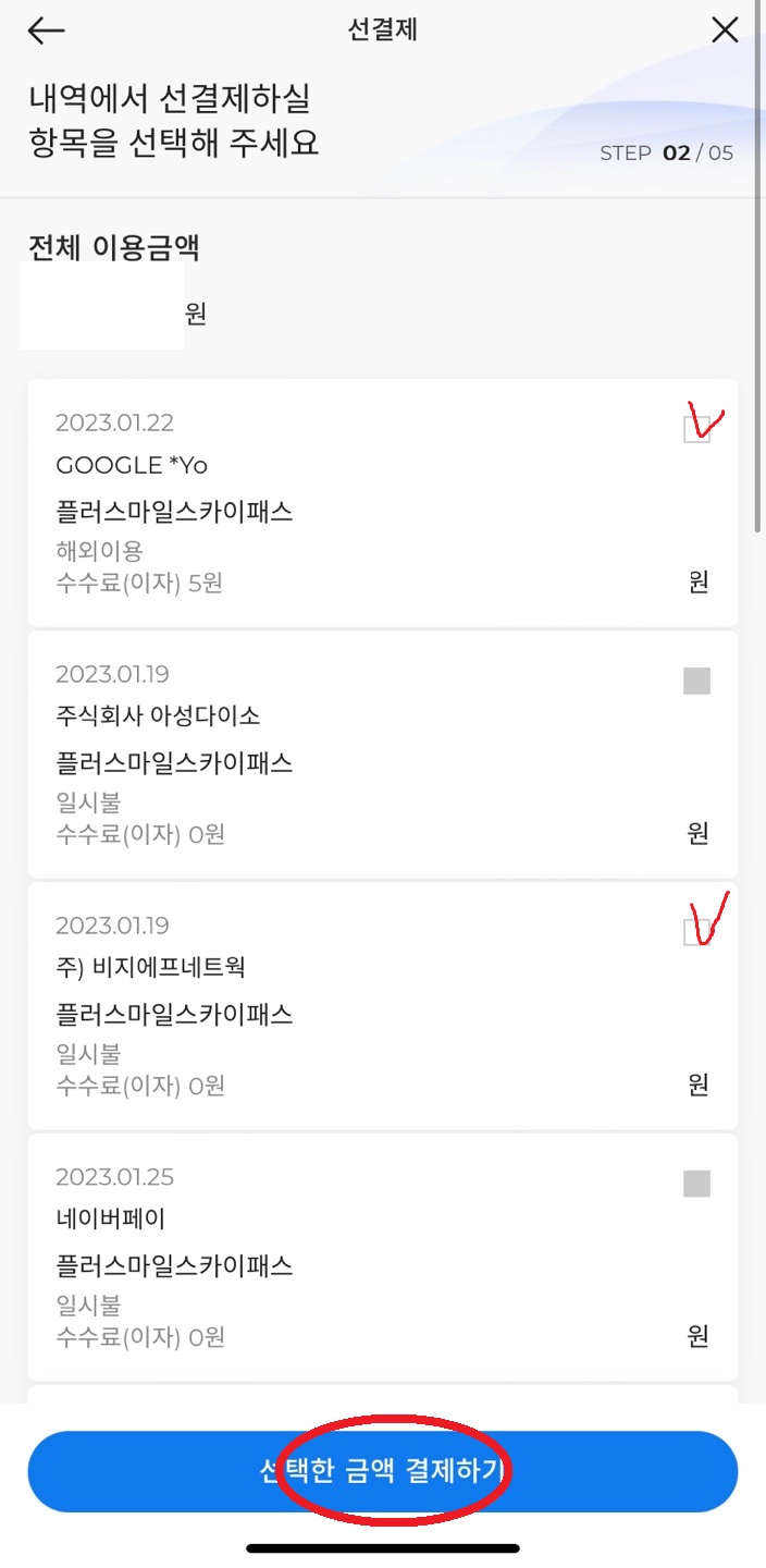 ○ 선결제를 할 항목을 선택한다.