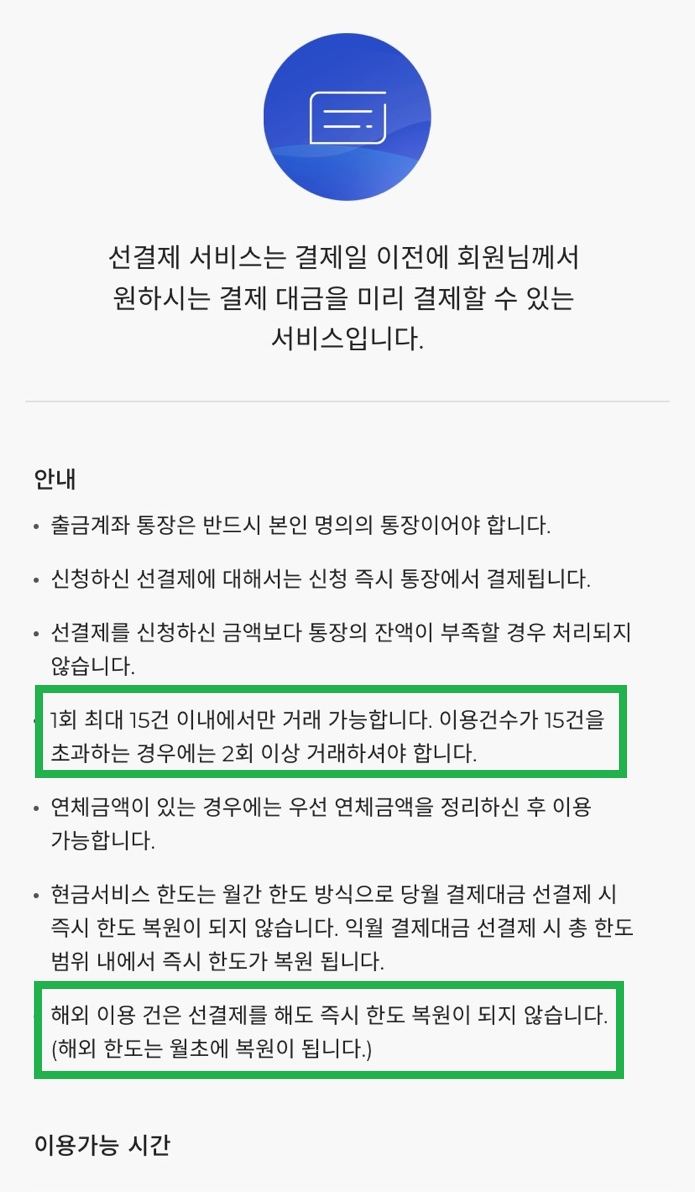 ○ 신용카드 대금 선결제 주의 사항이다.