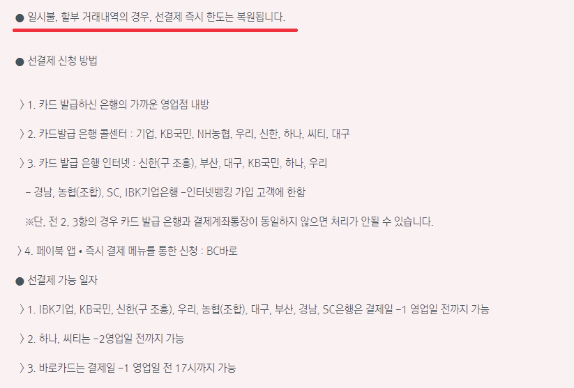 ◆ BC카드 즉시결제(선결제)는 해당 은행을 통해 진행해야 한다.