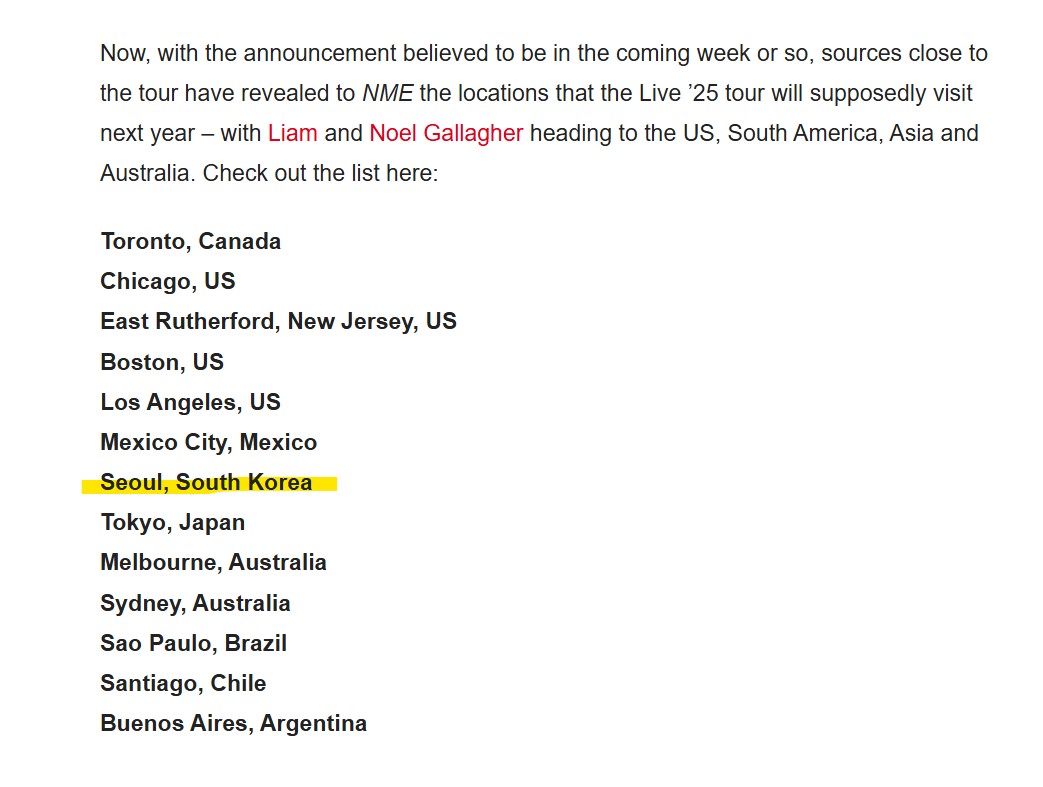 영국의 잡지 NME에서 오아시스의 Live '25투어가 예상되는 도시들을 발표했다.