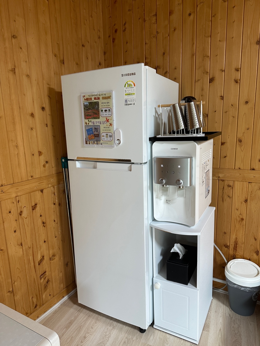 방에는 큰 냉장고와 정수기, 다회용컵, 전자렌지 등이 있다.