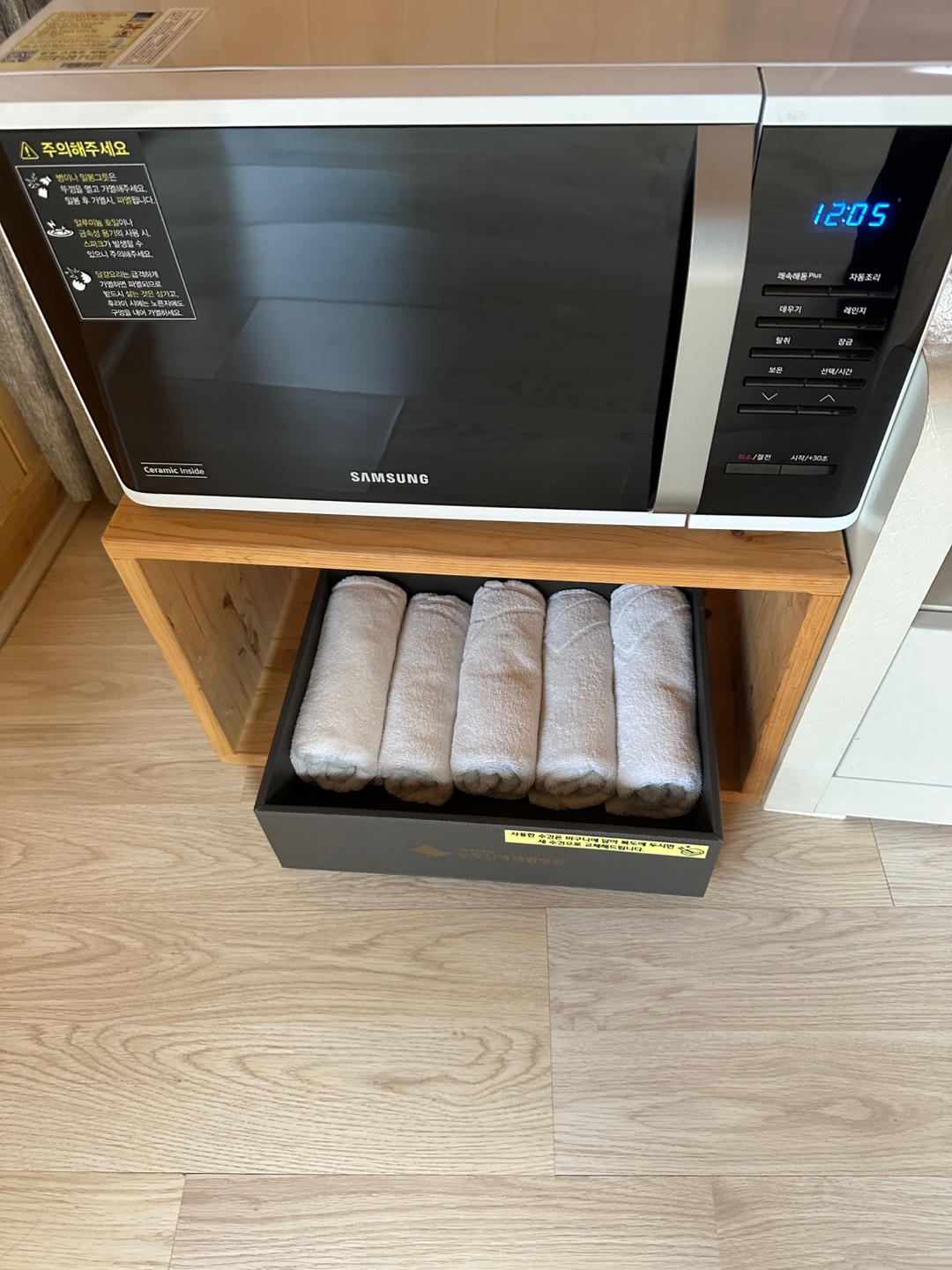 화장실에도 수건이 있는데, 전자레인지 아래에 수건 다섯개가 더 있었다.