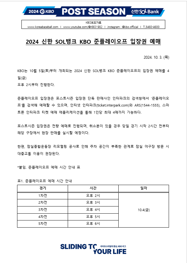2024시즌 KBO 프로야구 준플레이오프 대진이 결정되었습니다. 10월 5일부터 열리는 LG와 KT의 준플레이오프 경기는 10월 4일 입장권 예매가 가능합니다. 경기별 입장권 예매 오픈 시간을 알아보겠습니다.