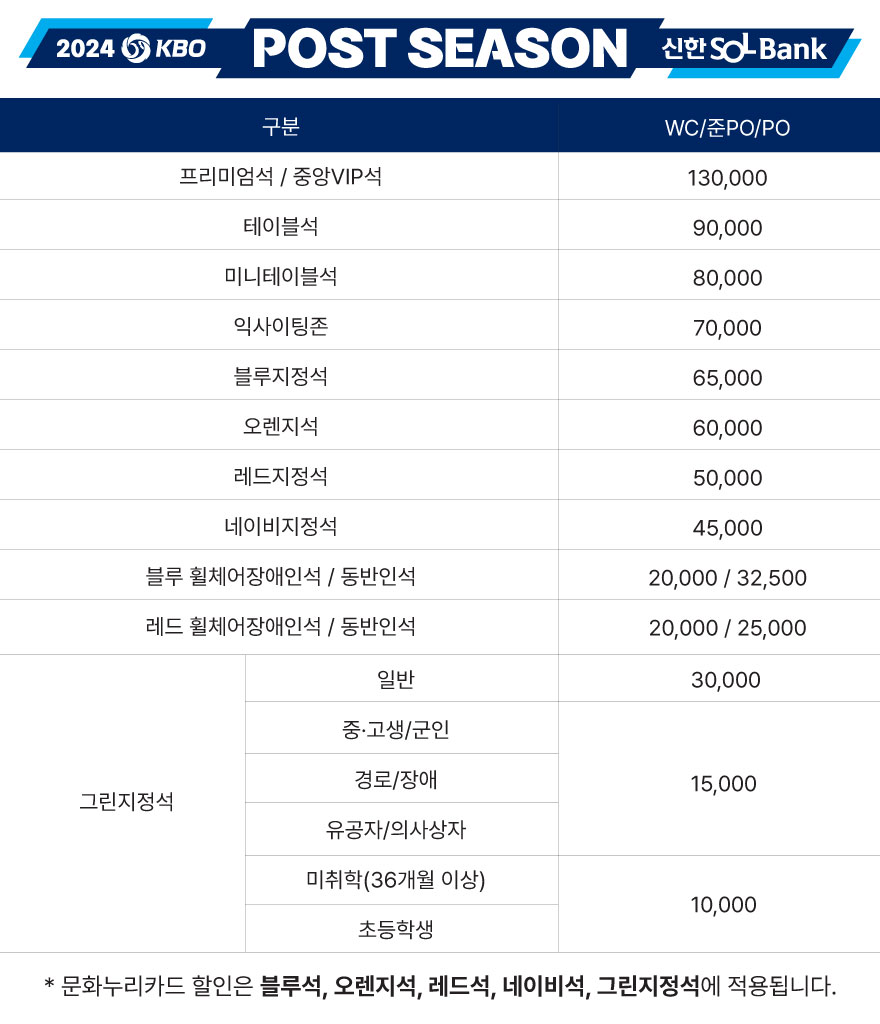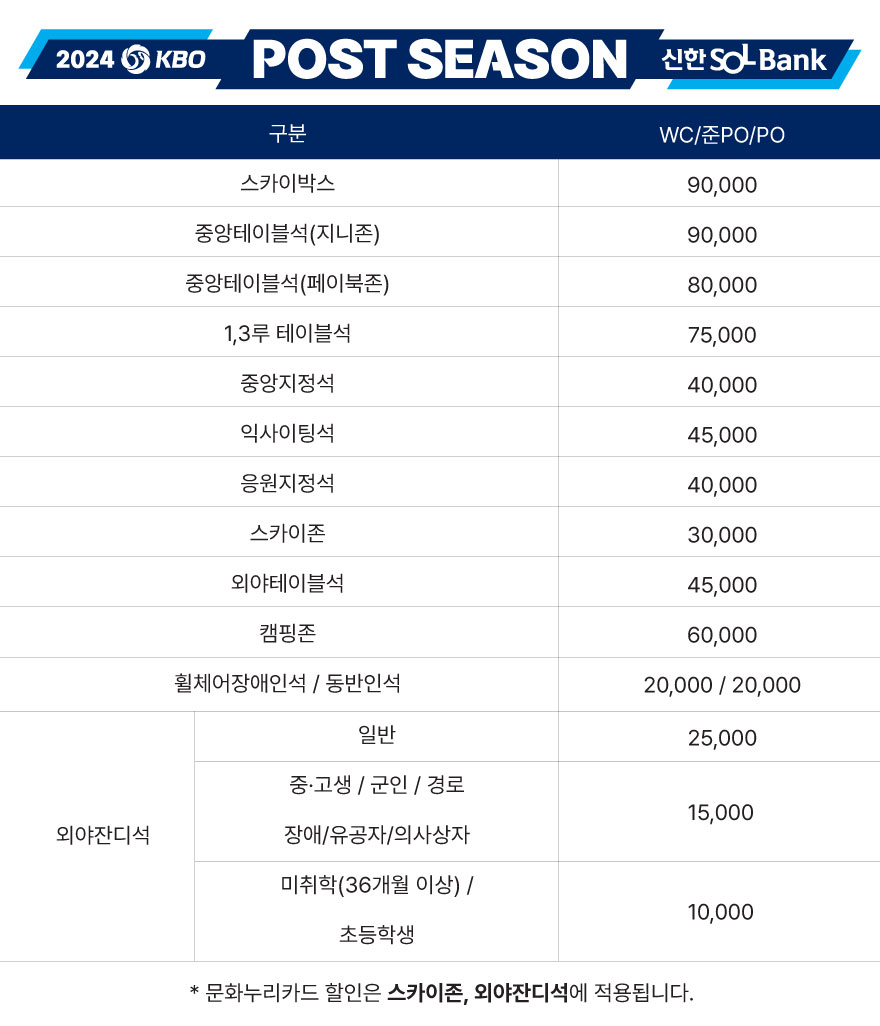 수원야구장 포스트시즌 입장료는 외야잔디석 25,000원, 응원지정석 40,000원 등이다.