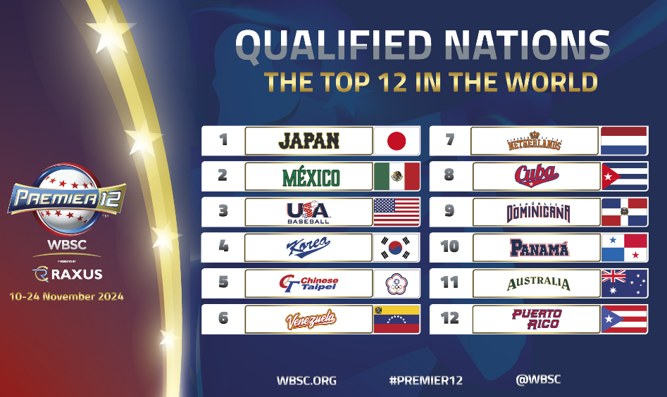 2024년 프리미어12는 남자야구 세계랭킹 1위부터 12위까지의 야구대표팀이 경기를 펼치는 대회다.