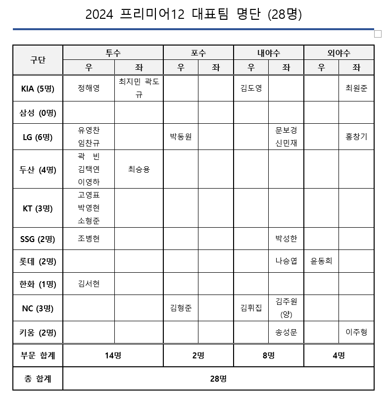 프리미어12 대한민국 대표팀은 28인으로 정해졌다.