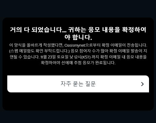 11월 23일(토) 낮12시까지 이메일 내 응모내용을 확정해야 선예매 추첨 응모가 완료된다.