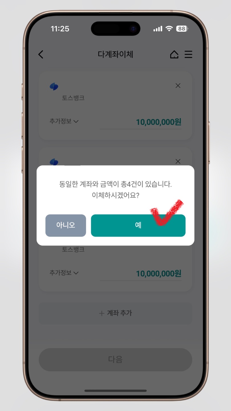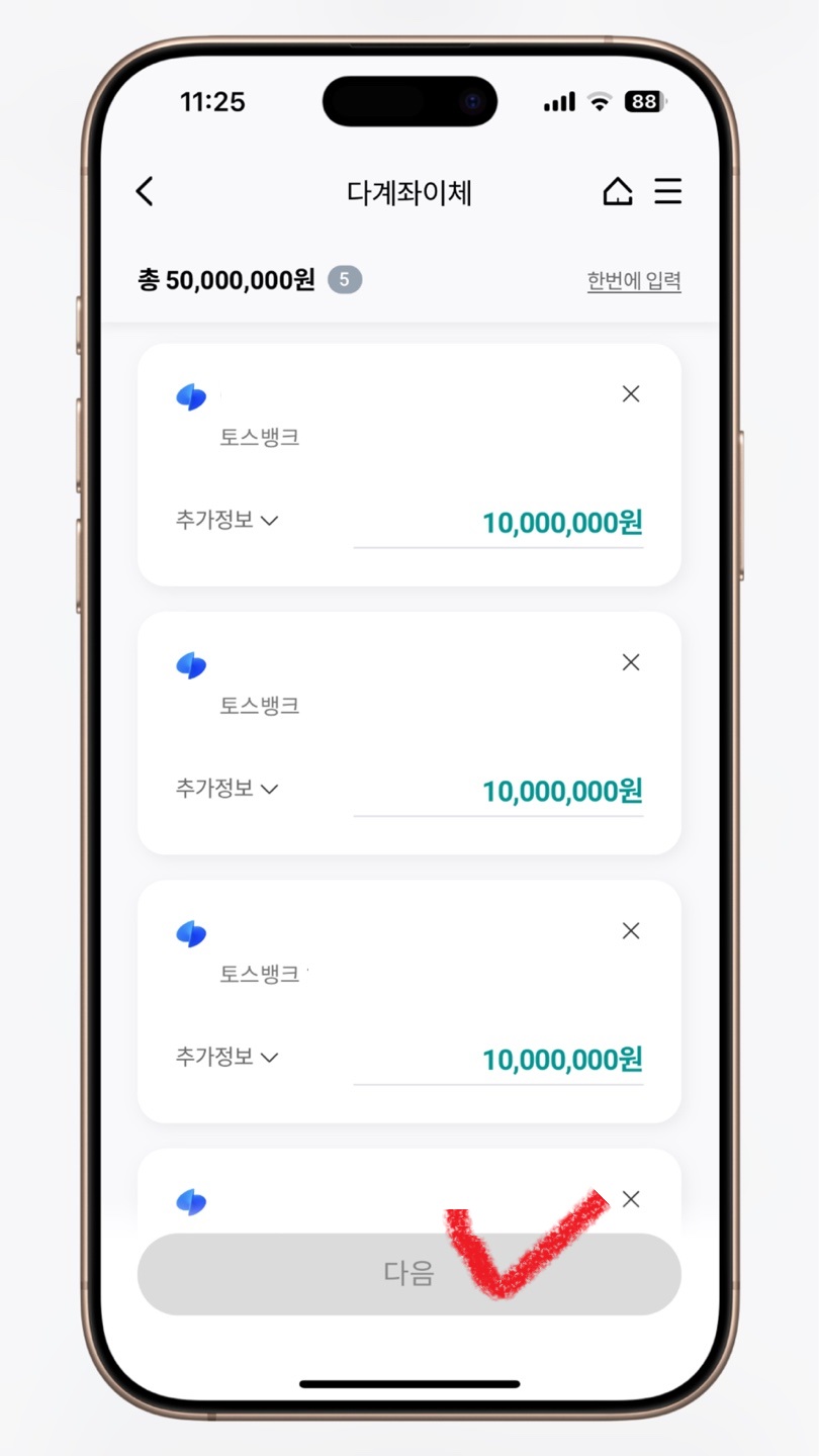 ✅ 이렇게 하면 1천만원씩 5번 들락날락하며 보내는 것보다 훨씬 간편하게 이체할 수 있다.