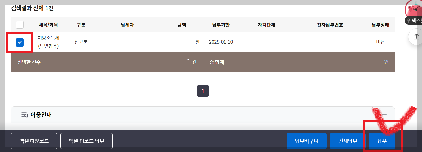 위택스에 오랜만에 접속하면 납부버튼 찾기가 힘들 수 있다.