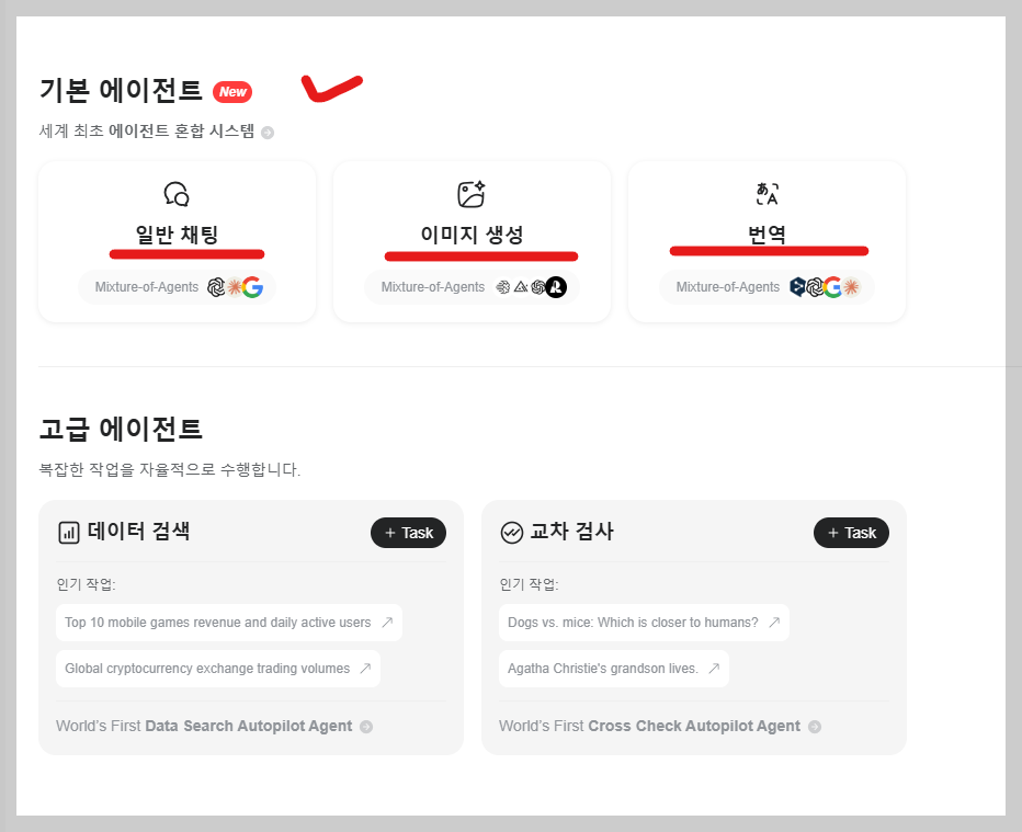 먼저 젠스파크에는 기본에이전트와 고급에이전트가 나뉘어 있다.