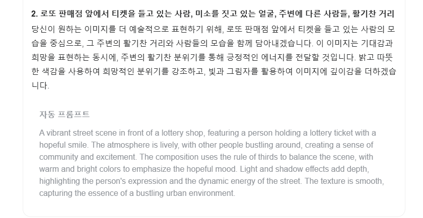 그러면 이렇게 자동으로 내가 원하는 이미지의 프롬프트를 자세하게 작성해서 이미지를 생성한다.