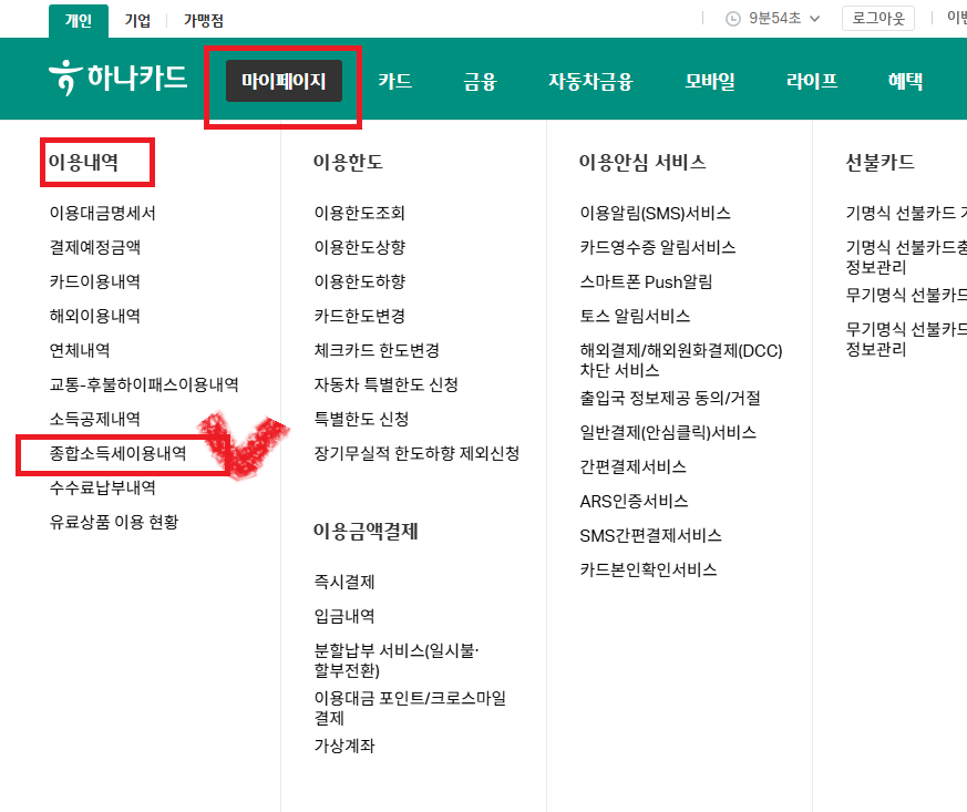 하나카드(https://www.hanacard.co.kr) - 로그인 - 마이페이지 - 이용내역 - 종합소득세이용내역