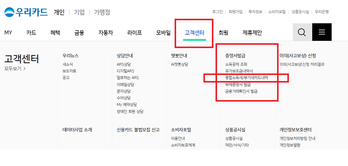 우리카드 홈페이지(https://pc.wooricard.com) - 로그인 - 고객센터 - 증명서발급 - 종합소득세/부가세카드내역 - 기간선택 - 신청