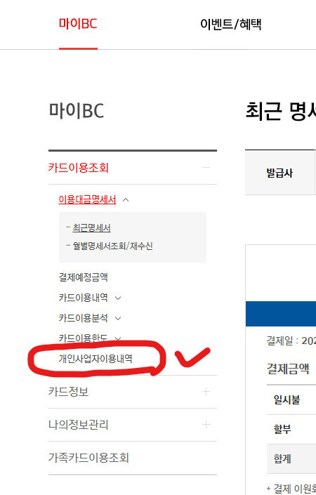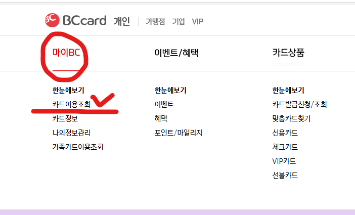 비씨카드(https://www.bccard.com) - 로그인 - 마이BC - 한눈에보기 - 카드이용조회 - 개인사업자이용내역