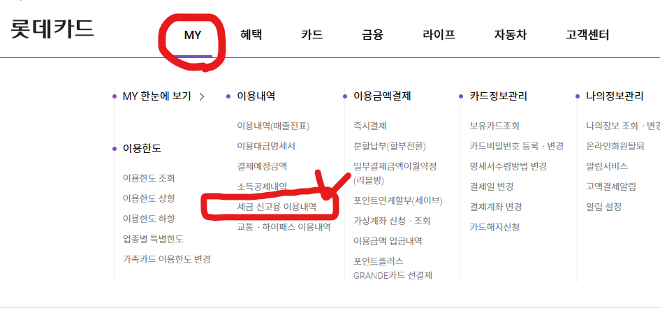 롯데카드(http://www.lottecard.co.kr) - 로그인 - MY - 이용내역 - 세금 신고용 이용내역