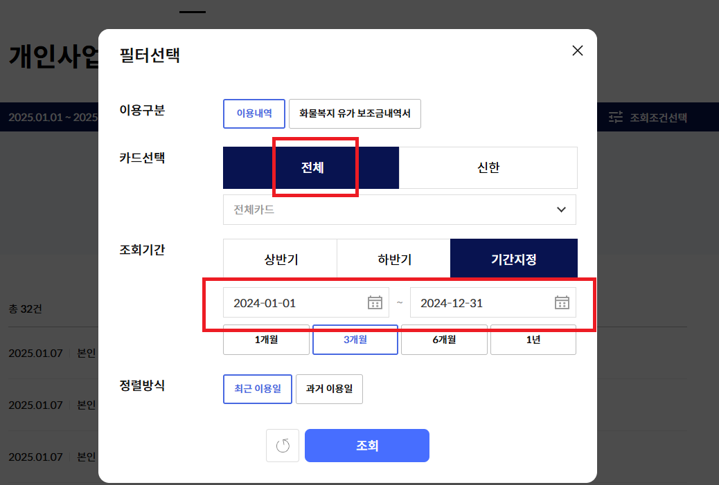 개인사업자가 세금 신고용 자료를 준비할 때, 카드 이용내역 조회가 필요합니다.