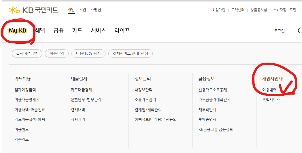 KB국민카드(https://card.kbcard.com) - 로그인 - My KB - 개인사업자 - 이용내역