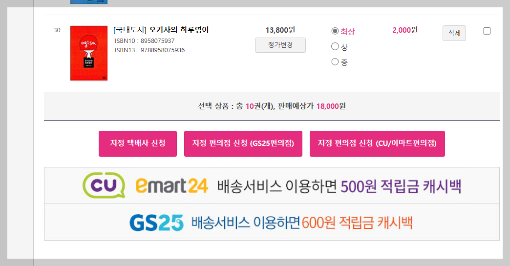 이렇게 신청하고, 책을 박스에 포장해서 GS편의점에 가서 발송하면 된다.