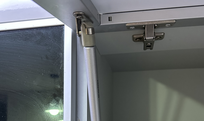 상부 찬장은 문을 위로 들어올리는 방식인데, 양쪽 쇼바의 압력이 빠져서 무게를 못버티는 것 같았다.