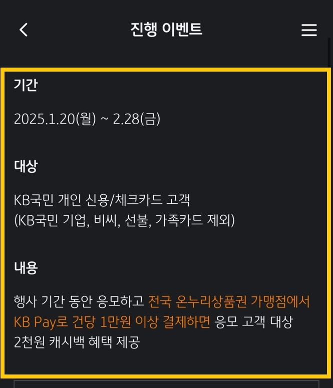 2월 중, 이벤트에 응모하고 온누리상품권 가맹점에서 KB Pay로 건당 1만원 이상 결제시 2천원 캐시백해준다.