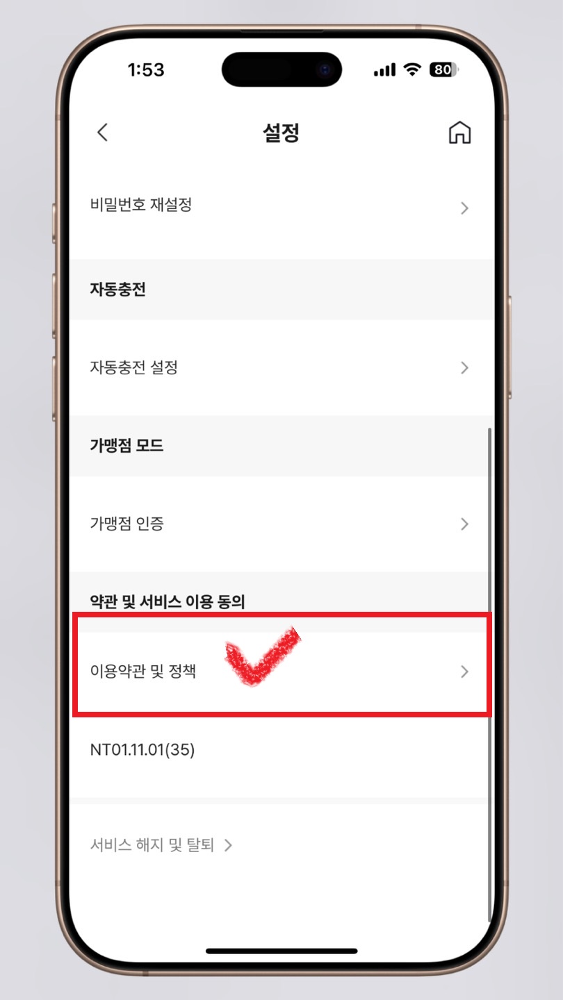 설정 메뉴 중 [이용약관 및 정책] 클릭.