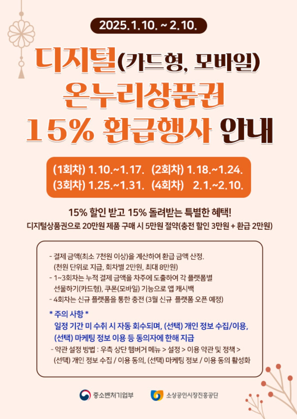온누리상품권 15% 캐시백 이벤트! 2월 10일까지 디지털 온누리상품권(카드형, 모바일형) 15% 할인 및 15% 추가 환급 혜택! 85,000원으로 10만원 충전! 결제액의 15%를 최대 2만원까지 환급! 단, 개인정보 및 마케팅 동의 필수! KB카드 추가 이벤트 참여 시 2천원 캐시백! 파리바게트, GS25, CU 등 다양한 가맹점에서 사용 가능!