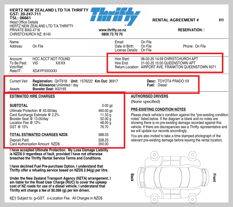 뉴질랜드 남섬 Thrifty 렌터카 이용 후 추가 결제된 178.91NZD 상세 내역을 공개합니다. 디젤 차량 렌트 시 부과되는 Road User Charge (RUC)와 첫날 덜 결제된 차액에 대한 정보, 주행거리별 RUC 계산 방법,