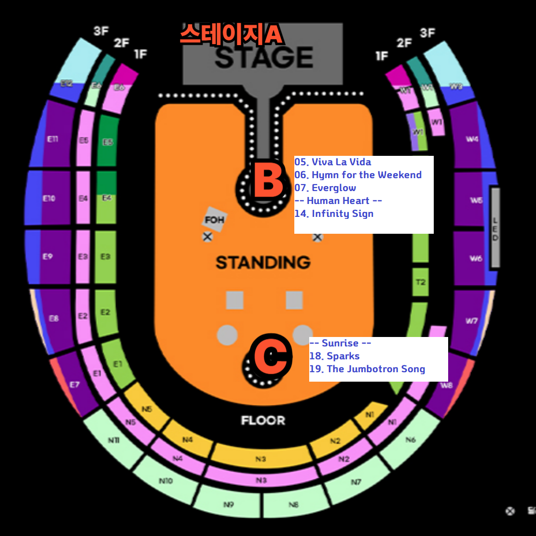 고양종합운동장처럼 큰 공연장에서 투어를 하는 콜드플레이의 콘서트에는 메인스테이지 외에 B스테이지(돌출무대), C스테이지가 마련되어 있다.