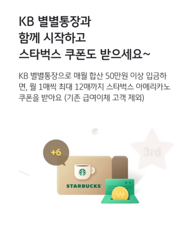 1. KB별별통장 개설 후 매달 타은행에서 50만 원 이상 입금 시 스타벅스 아메리카노 쿠폰을 받을 수 있다.