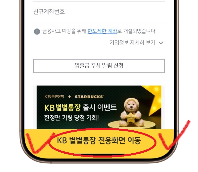 KB은행 어플에서 위 링크를 선택하거나, 이벤트 탭에서 KB별별통장 출시 행사로 들어간다.