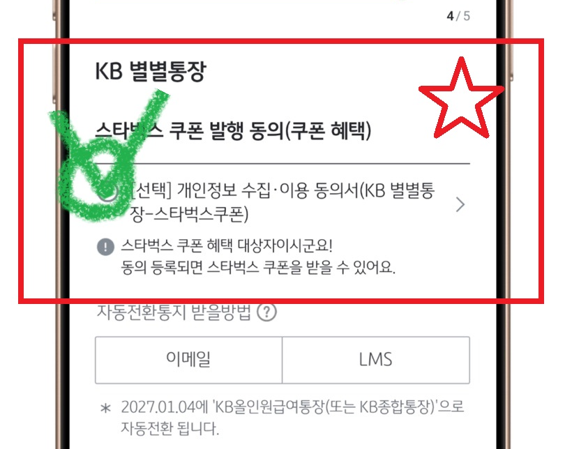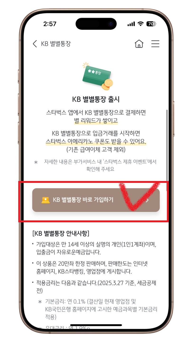 ✅ 스벅 앱에서 KB별별 통장을 등록하고 계좌간편결제 하면 추가별 +1 적립.