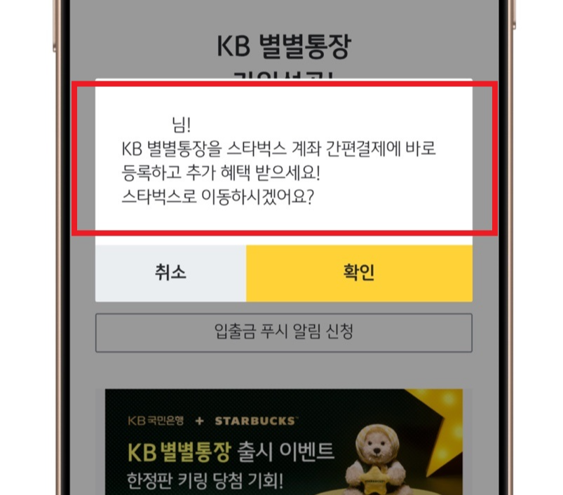 KB 별별통장을 개설하고 급여이체 조건을 충족하면 매월 스타벅스 아메리카노를 주는 행사를 진행 중이다.