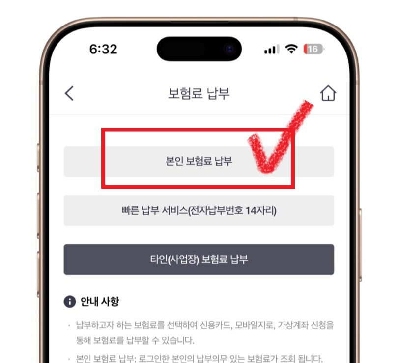 ✅ 건강보험 앱에 로그인한다.✅ 보험료납부 선택본인인 경우 본인 보험료 선택, 사업자인 경우 타인(사업장) 보험료 선택