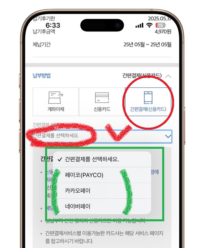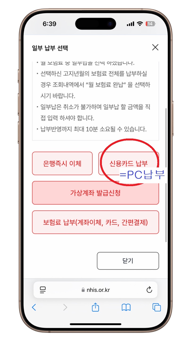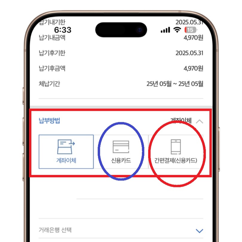 ✅ 여기서 [신용카드 납부]를 선택하면 pc(홈페이지)에서 납부하는 것과 같다.