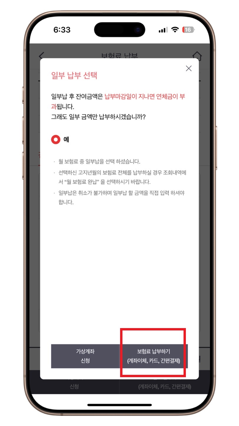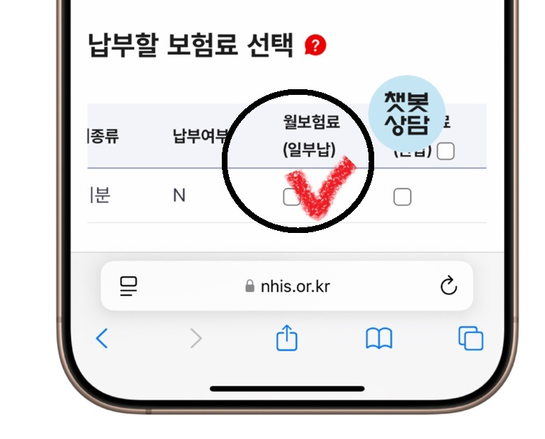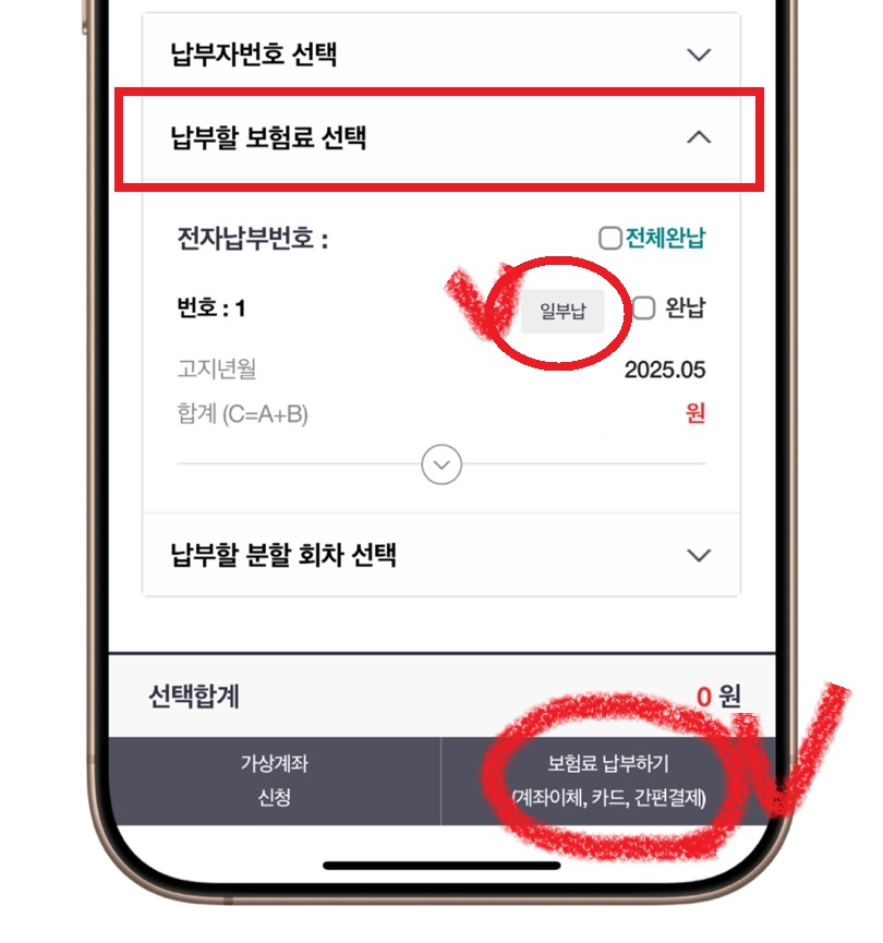 ✅ 납부할 보험료 선택 👉 [일부납] 체크 👉 보험료 납부하기
