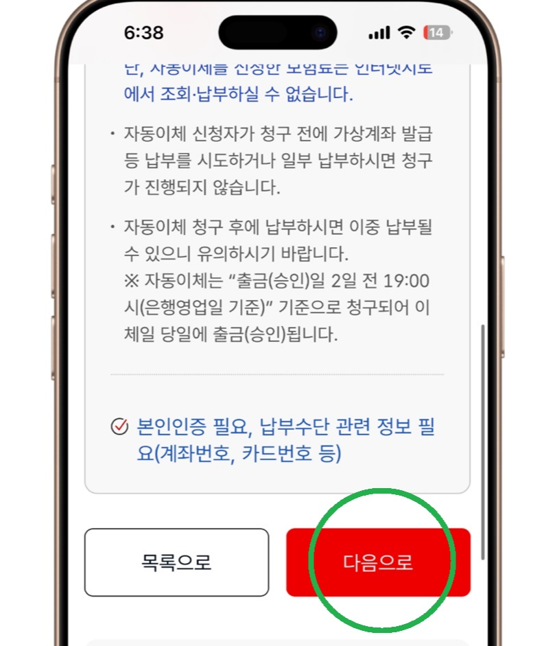✅ 납부할 보험료 선택에서 하늘색 네모를 터치한다.