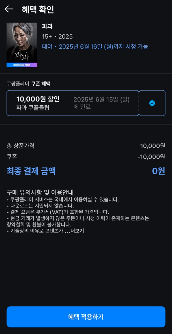 영화 《파과》를 0원에 대여할 수 있는 쿠폰을 제공합니다.