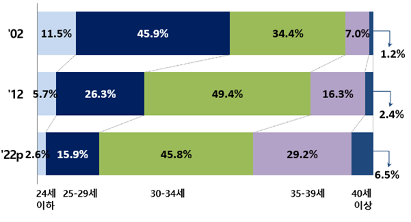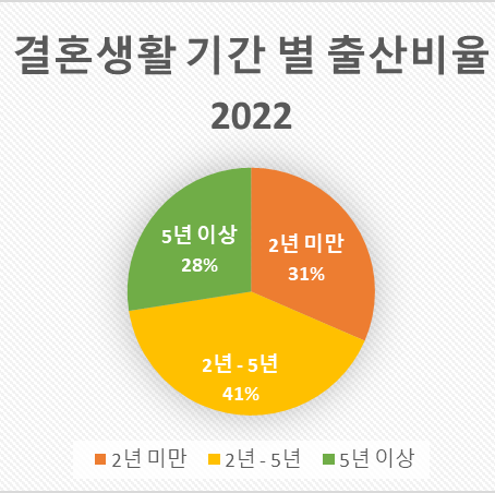 2022년 출산한 여성 중 31.5%가 결혼 2년 미만, 41%는 2년~5년 사이, 27.5%는 5년 이상인 경우였다.