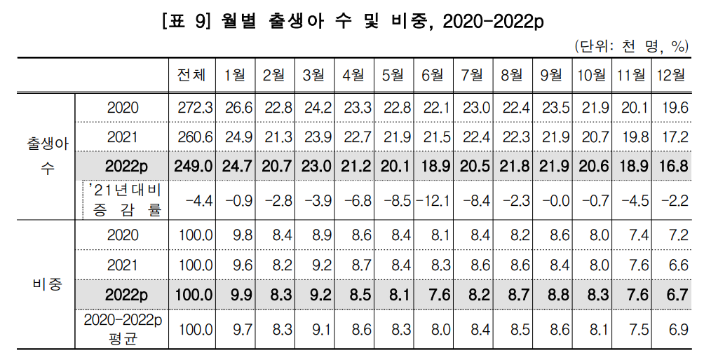 2021년 대비, 출생아가 1만 1천 5백명 감소하여 조사 이래 처음으로 25만명 아래로 내려갔다.