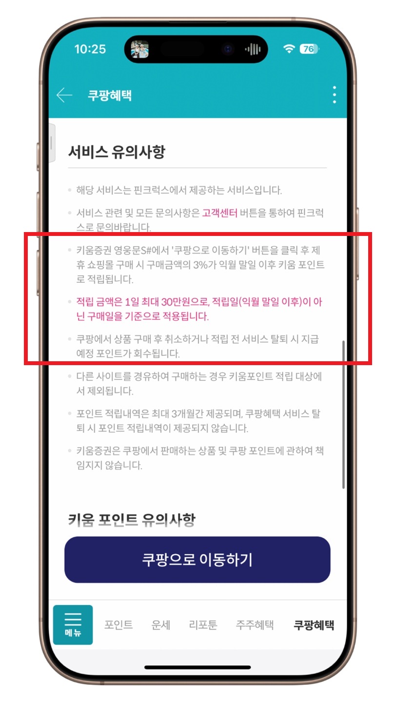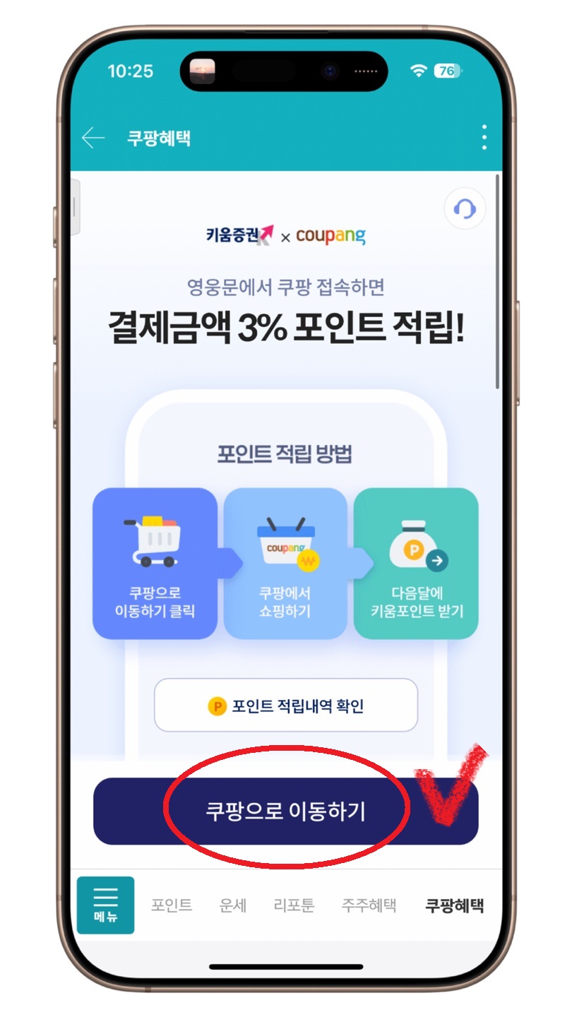✅ 쿠팡으로 이동하기 버튼을 눌러 쿠팡에 접속한 후에 결제하면, '다음달'에 '키움포인트'로 3% 적립된다.