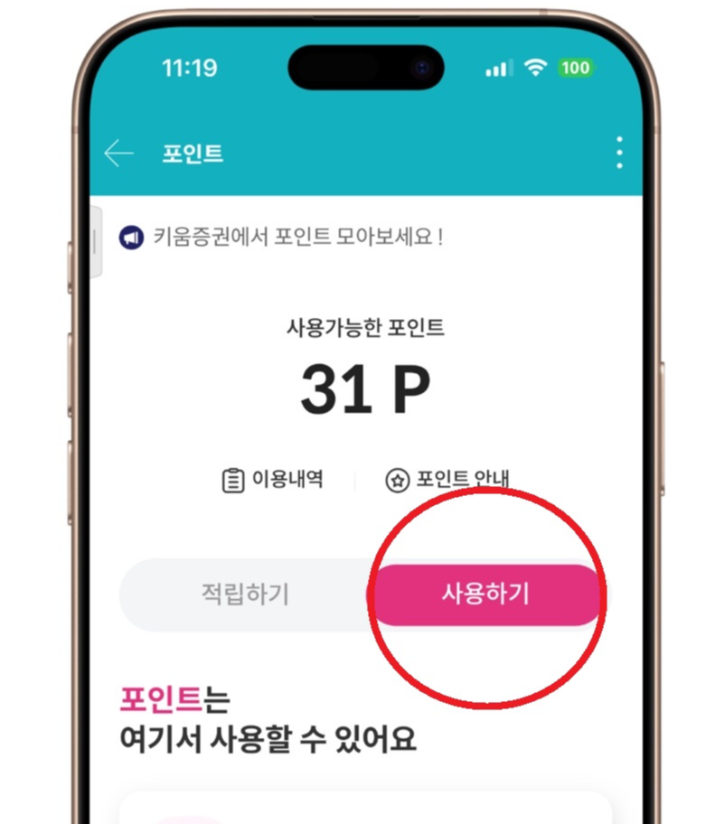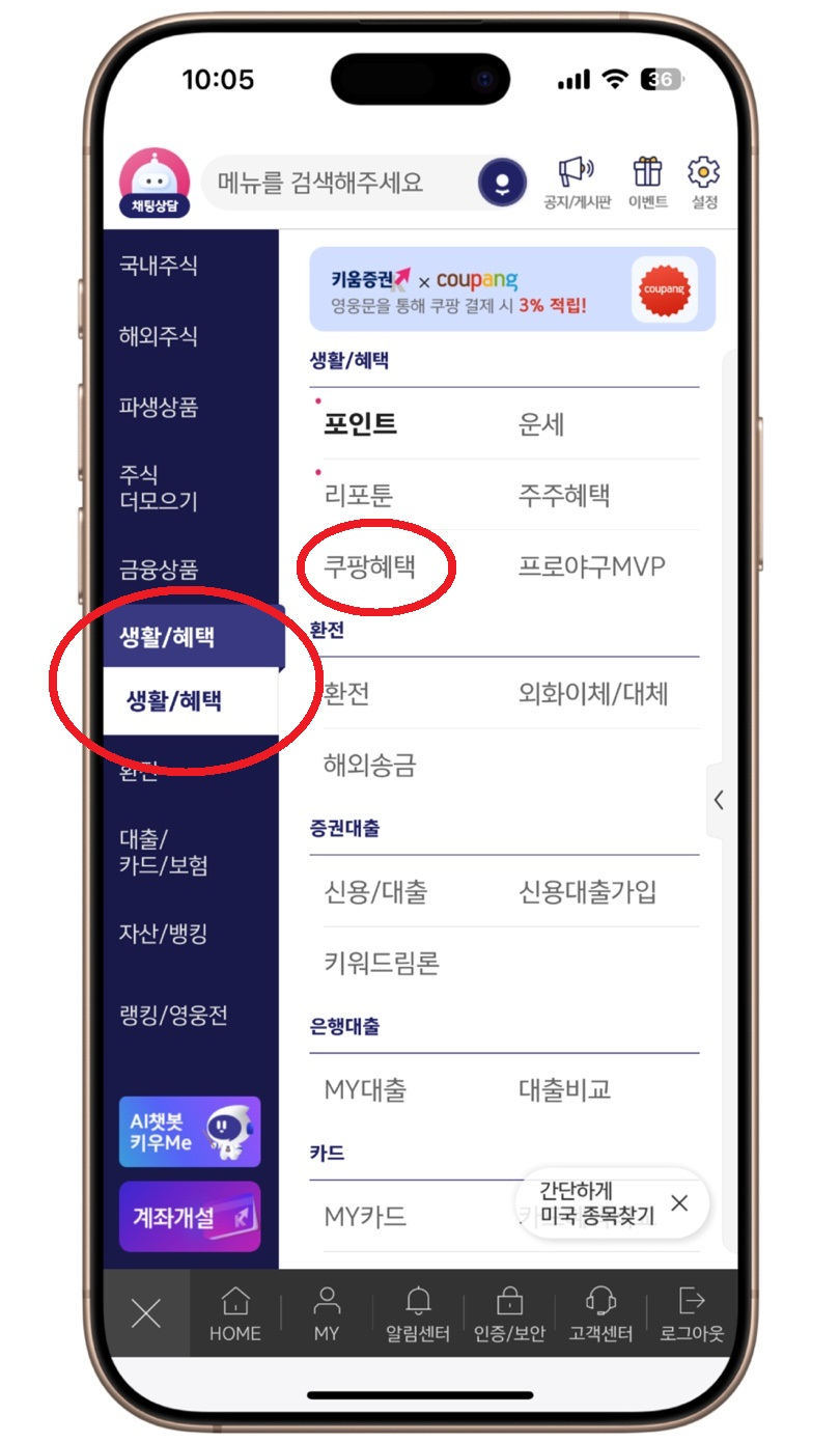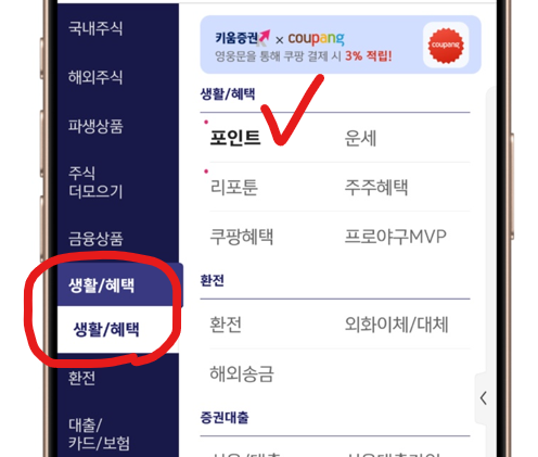 ✅ 영웅문S에서 메뉴 - 생활/혜택 - 포인트를 선택한다.