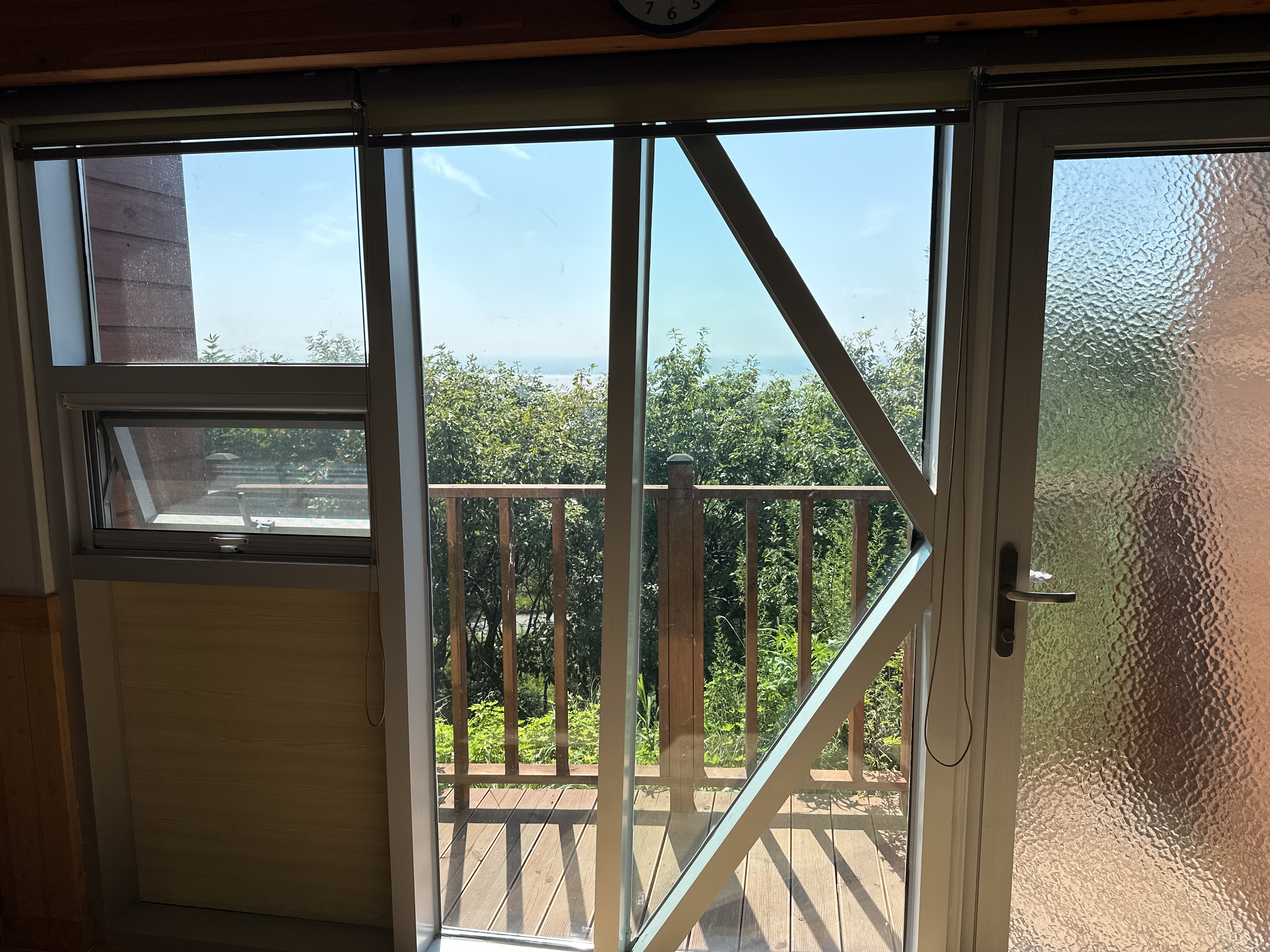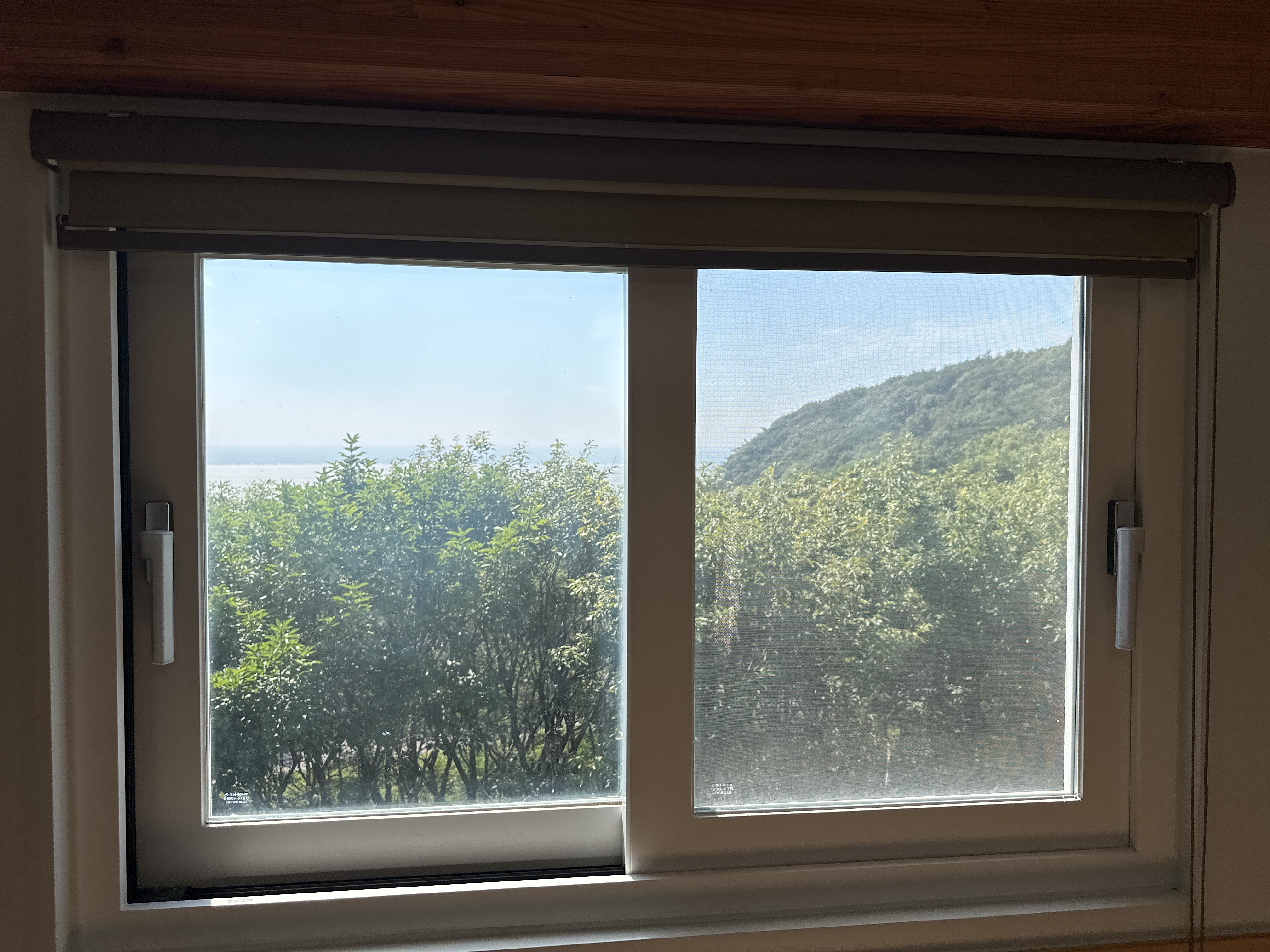 일어서서 객실 앞쪽 나무를 넘어서 봐야 바다가 보인다는 점이었어요!