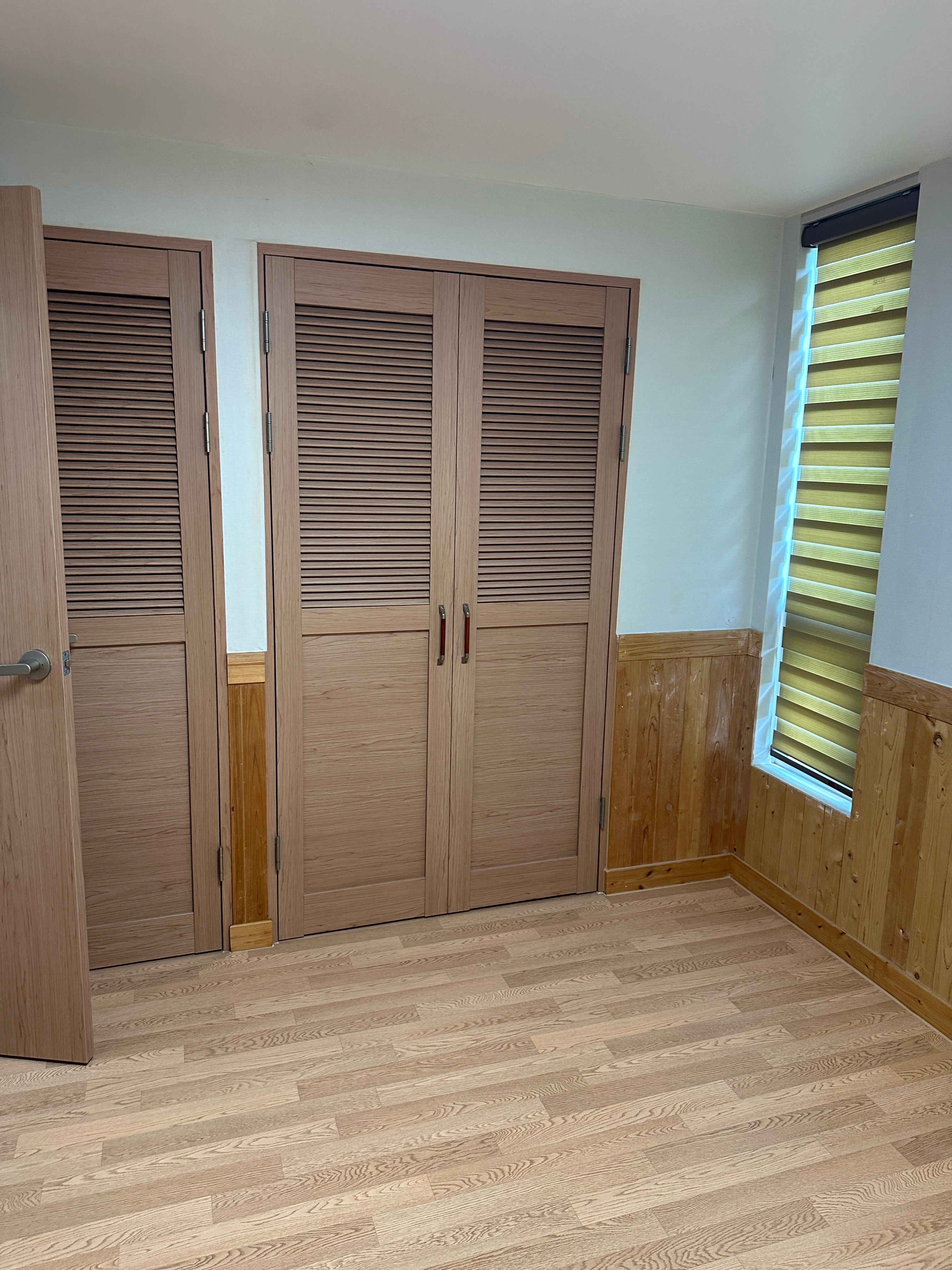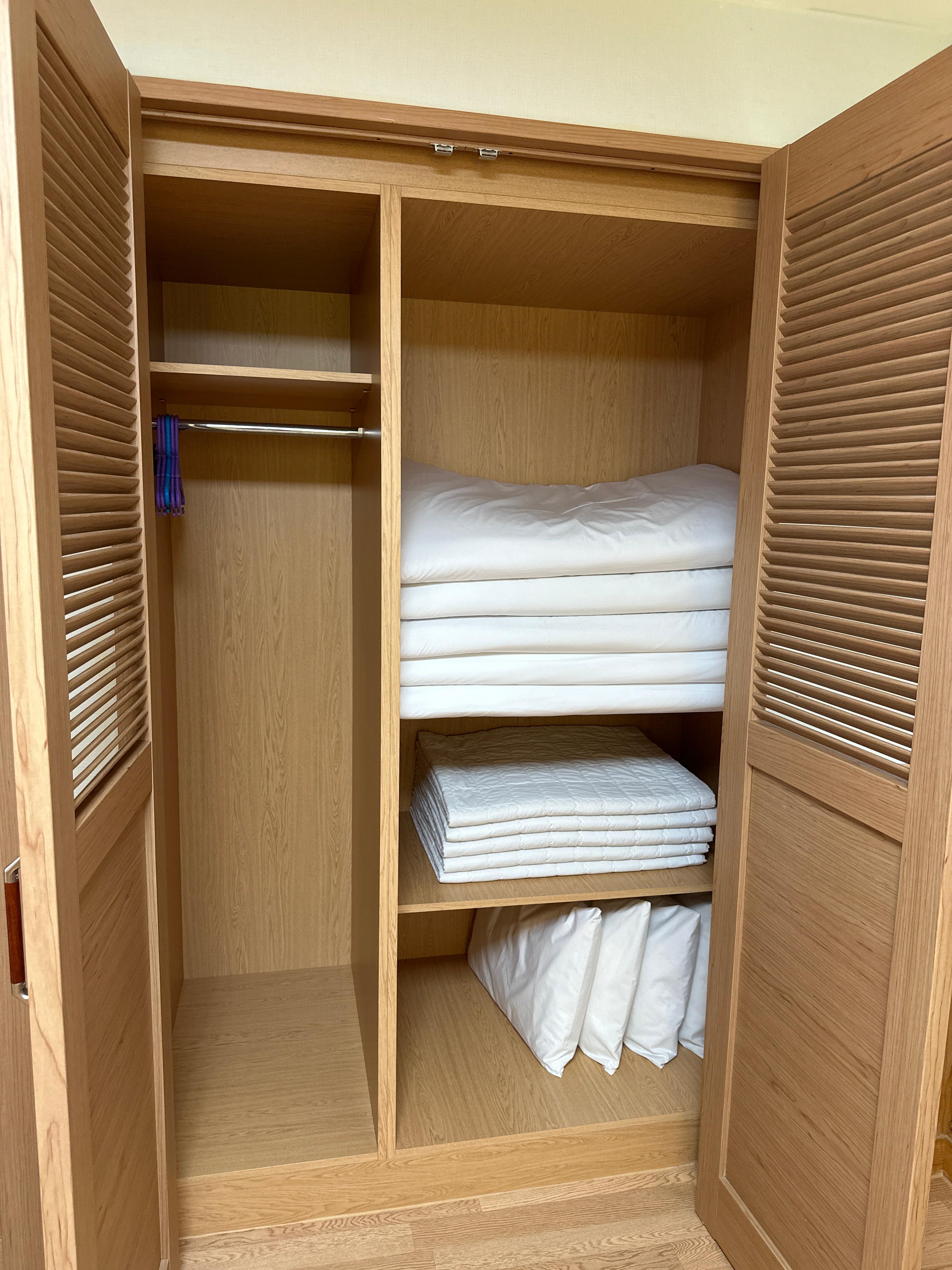 붙박이장을 열어 보면 베개와 이불, 요 다섯채가 들어 있어요.