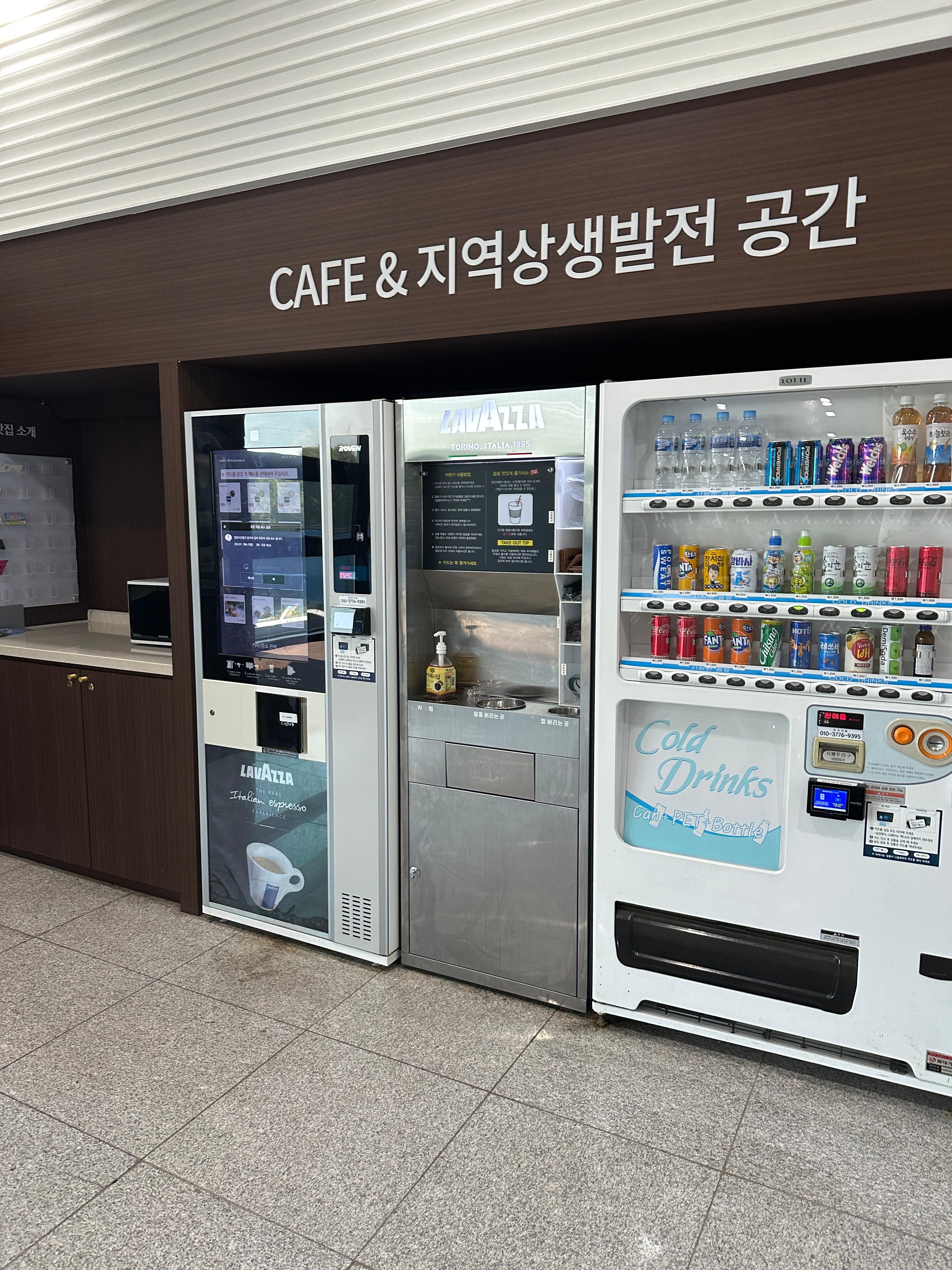 방문자 안내 센터에 음료수 자판기, 라바짜 커피 자판기, 전자레인지가 있어요.