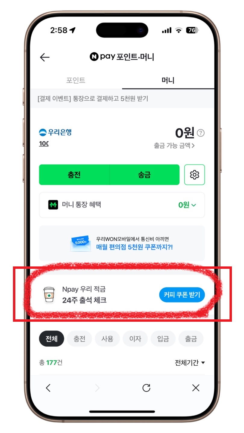 네이버페이 Npay 머니통장 (npay 우리 적금) 24주 출석체크 찾기