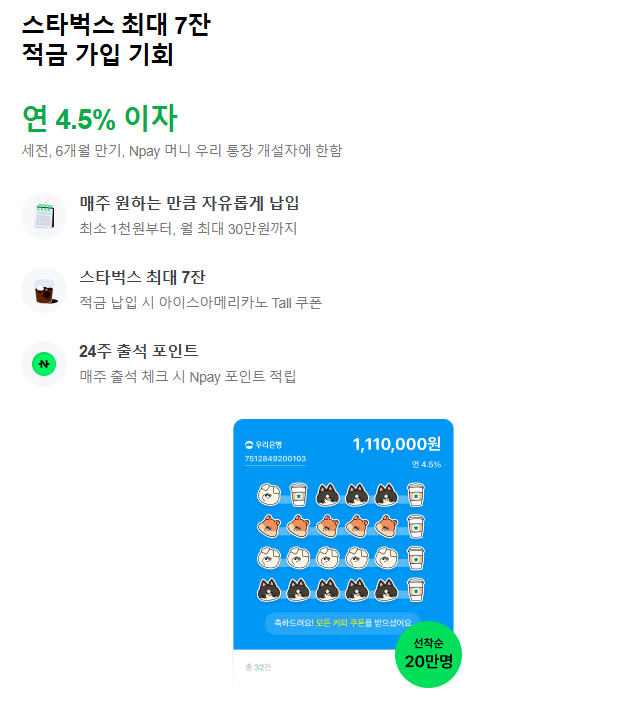 네이버페이가 Npay 머니 우리 통장을 출시했습니다. 통장을 만들면 네이버포인트 5천 원을 받고, 적금 가입 후 24주 동안 매주 출석 체크하면 스타벅스 커피 쿠폰을 최대 7잔 받을 수 있습니다. 출석 체크는 네이버페이 앱에서 쉽게 할 수 있습니다.