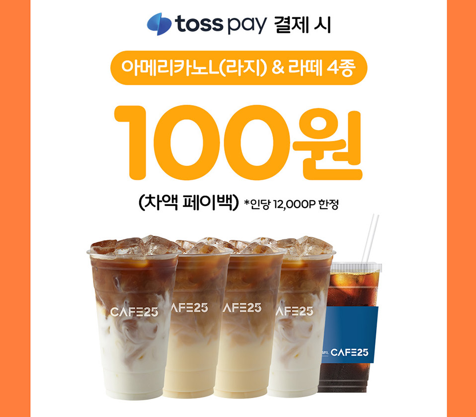 CAFE25에서 아메리카노, 라떼 4종 라지(L) 사이즈를 100원에 구입할 수 있어요.