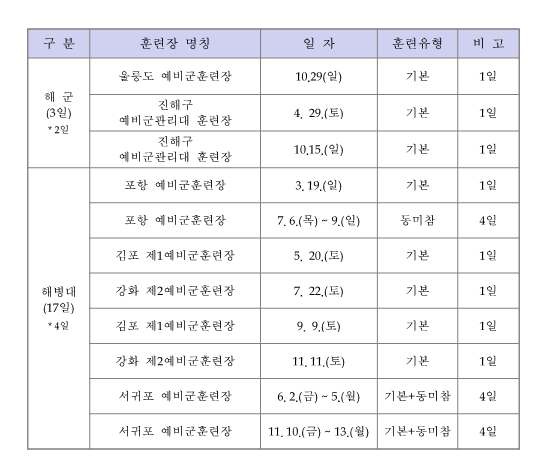 또 자신이 동미참훈련이 필요한지 기본 훈련이 필요한지에 따라서 가능한 휴일예비군이 따로 있다.